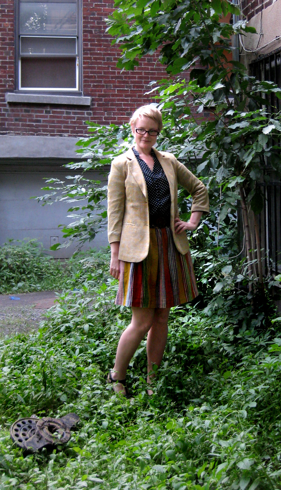 | Anthropologie To-a-Tee blazer, Amhara skirt and Agadja belt, no-name polka dot blouse, Clarks wedges, unknown machine part marooned in my yard |